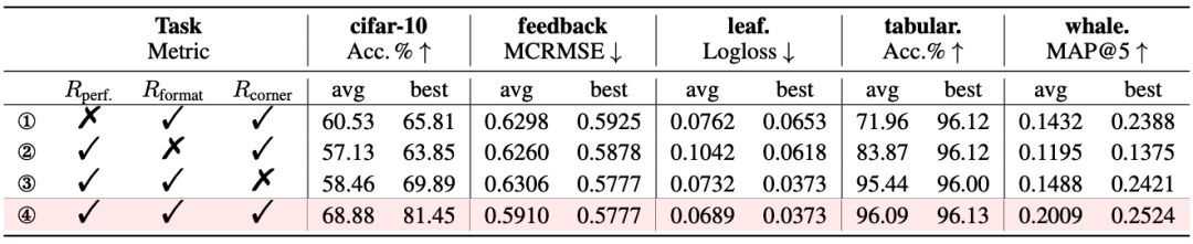 对机器学习(ML)特定的奖励模块进行消融研究,表明三个组成部分的必要性。这三个组成部分分别是归一化性能奖励(Rperf.)、格式奖励(Rformat)和边缘情况奖励(Rcorner )。CIFAR-10和反馈是保留任务,其他则是排除任务。该奖励模块的核心思想是将每种执行结果映射到一个统一的标量值。例如: