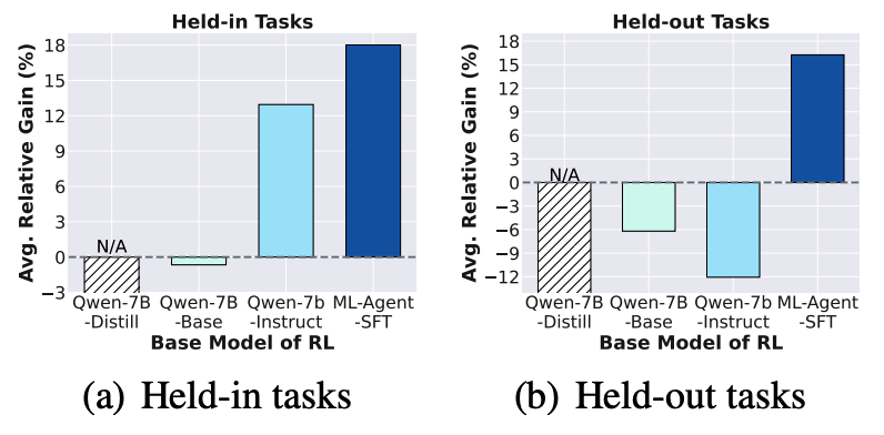 关键组件的深入分析 探索增强微调的重要性验证 为了验证探索增强微调的重要性,研究者们进行了对比实验,分别以 Qwen-7B-Base、Qwen-7B-Instruct、Qwen-7B-Distill 和 ML-Agent-SFT 作为基础模型进行 RL 训练,并比较了这些智能体在已见和未见任务上的平均相对增益。 探索增强的微调对于强化学习(RL)训练至关重要。“N/A”表示基于该模型的训练未能产生有效结果实验结果表明,以 ML-Agent-SFT 为基础模型的智能体在已见任务上的平均相对增益达到了约 18%,在未见任务上达到了约 16%,而其他基础模型的表现则相对较差。例如,Qwen-7B-Distill 在已见和未见任务上的平均相对增益几乎为零,这主要是因为其在 distillation 过程中采用了默认的输出格式,导致其生成的动作不符合自主 ML 的要求,从而在 RL 训练的数据收集阶段就无法产生有效的学习信号。