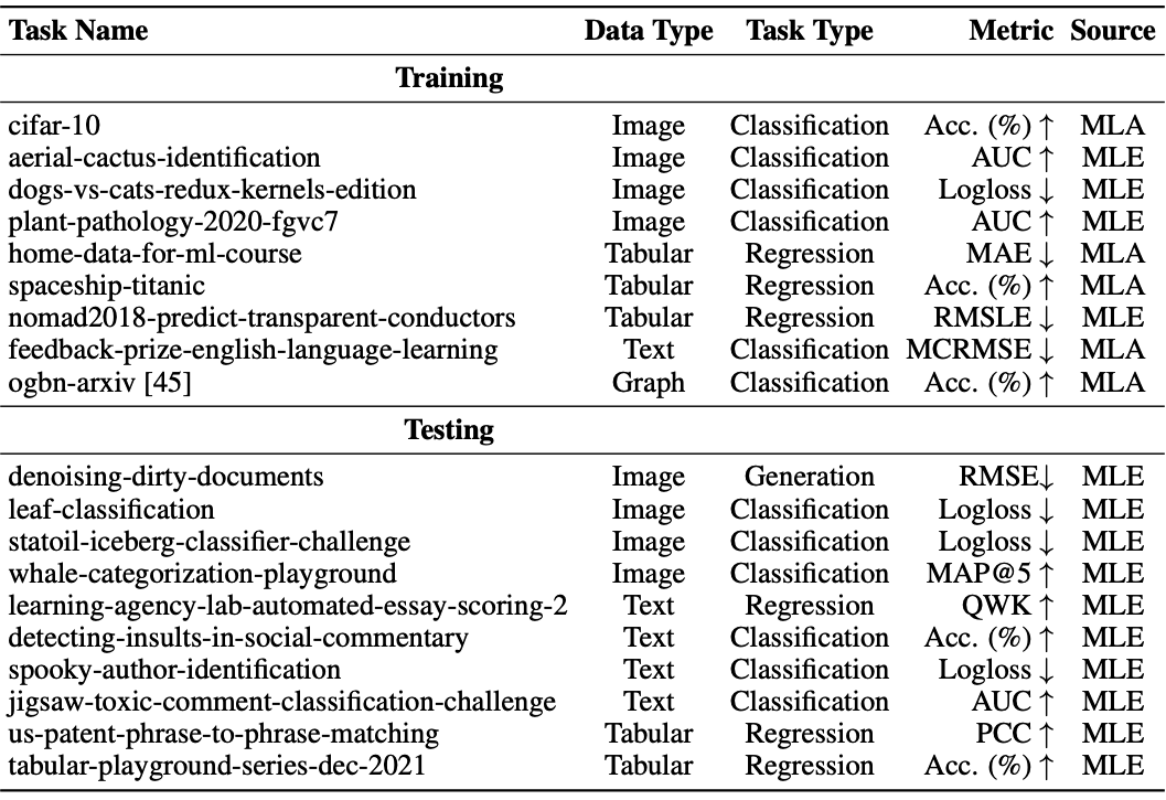 在实验中使用的所有训练和测试任务。MLA和MLE分别代表MLAgentbBench和MLE-bench