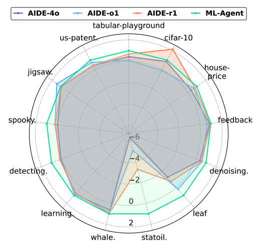 同时,研究者们还观察到,随着训练的深入,ML-Agent 的性能提升幅度在不同任务上有所差异。例如,在一些简单的任务(如 home-data-for-ml-course 表格回归任务)中,智能体的性能可能在较短的时间内迅速达到较高水平,而在一些复杂的任务(如 detecting-insults-in-social-commentary 文本分类任务)中,性能提升则相对缓慢,但提升空间更大。这种差异反映了不同任务的难度和智能体的学习曲线,也表明 ML-Agent 的训练框架具有良好的适应性,能够根据任务的特点自动调整学习策略。