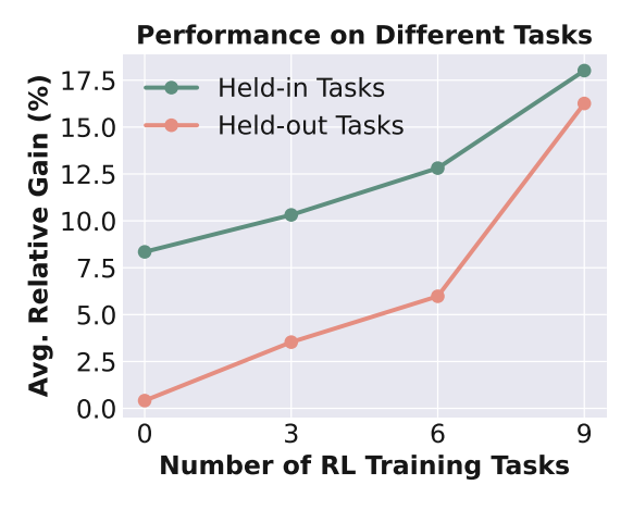 训练任务数量对强化学习性能的影响*。纯监督学习(SFT)模型表现出极小的泛化能力,而强化学习(RL)则推动了泛化能力的提升 从图表中可以看出,ML-Agent 的性能提升速度明显快于传统的基于剧集的 RL 方法。在训练初期(GPU 时间约为 2 小时时),ML-Agent 的平均相对增益已经达到了约 5%,而基于剧集的 RL 方法可能仅能达到 2% 左右。这种性能提升的优势随着训练的进行不断扩大,最终使 ML-Agent 在所有任务上都取得了显著的领先地位。