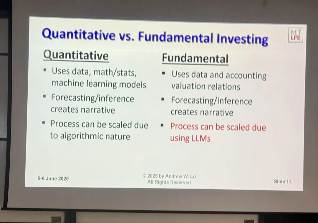 💡 LLMQuant参会观点与未来展望 本次会议的高光时刻,是Andrew Lo教授强调的“Quantamental投资”概念。Lo教授表示: