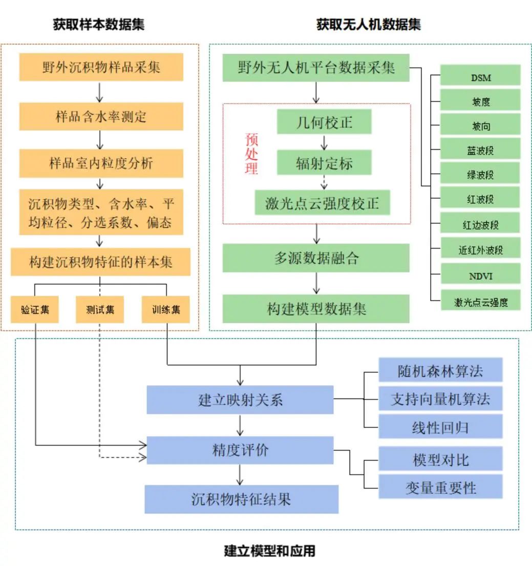 海岸沉积物的输移过程在塑造海岸地貌中起着关键作用,而沉积物属性(如粒度)是理解地貌动力学的基础。然而,沉积物的野外采集和实验室分析耗时费力,对沉积物时空变化的大规模快速监测构成重大挑战。无人机平台结合机器学习技术为高效获取和分析沉积物特征提供了有前景的解决方案。研究团队从中国浙江省南田岛的大沙沙滩采集表层沉积物样本,对文本型的沉积物类型进行数字化编码。利用3台无人机获取10组空间和光谱数据集,结合机器学习模型与传统数学方法,对沉积物类型、沉积物含水量、平均粒度、分选系数和偏度五项沉积物特征进行了预测。在测试的模型中,随机森林模型表现优异,沉积物类型的总体精度达95.65%。对于其他四项连续变量,随机森林模型在验证集和测试集上的平均R²分别为0.86和0.82,显著优于传统的多元线性回归方法。研究发现,近红外(Near-Infrarer)