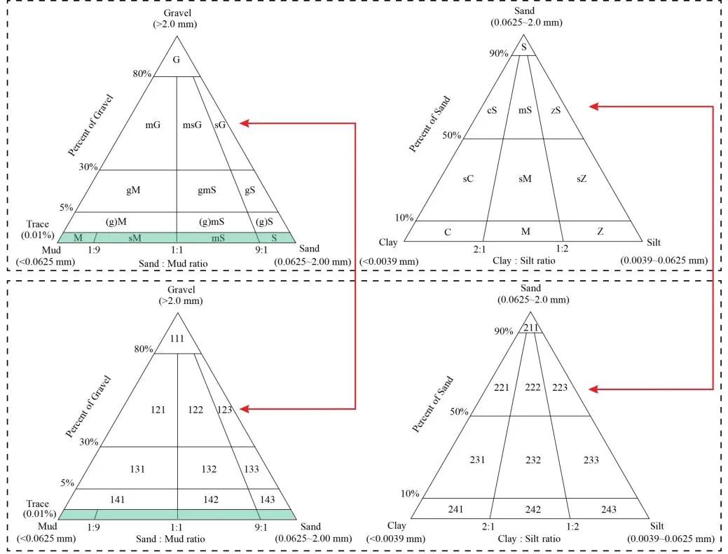 图3 将离散-文本型福克法沉积物类型进行数字化编码。为避免双重定义,左下角绿色区域中的M,sM,mS,S不参与编码。