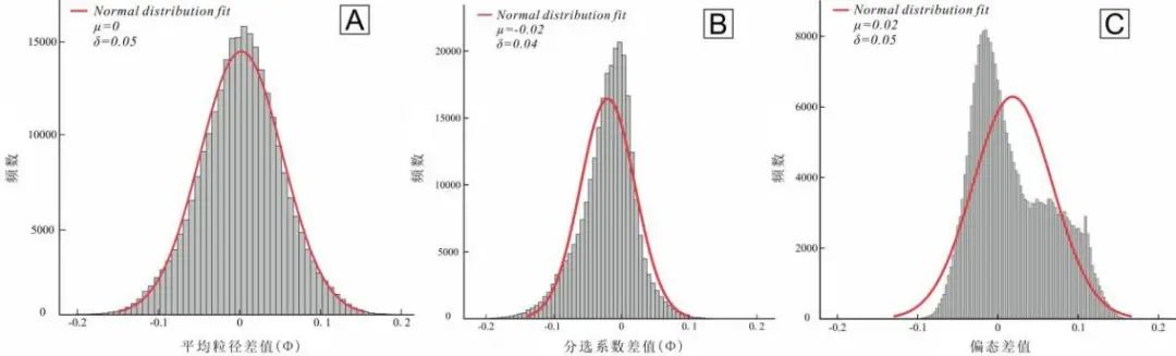 图8 ML1、ML2方法对比的结果。(A)平均粒径的差值(Φ),(B)分选系数的差值,(C)偏态的差值。