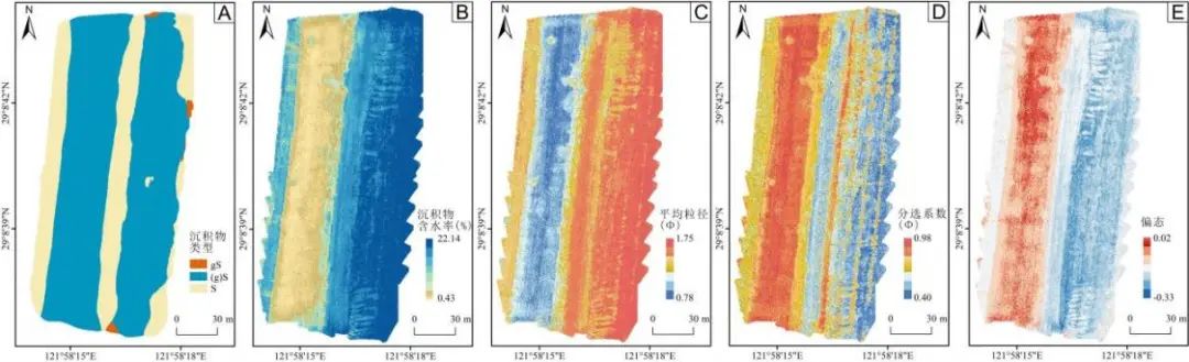图4 随机森林随机森林算法预测结果。(A)沉积物类型,(B)含水率,(C)平均粒径,(D)分选系数,(E)偏态。
