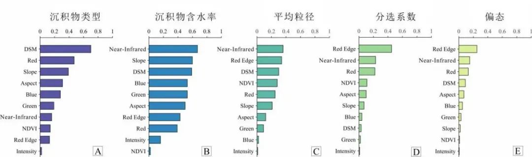 时,近红外、红边、DSM、红光、坡度等5个空间-光谱数据起了较大的作用,这印证了无人机空-谱域数据结合的必要性,也指示了这5个变量对预测沉积物特征的重要程度(图5)。