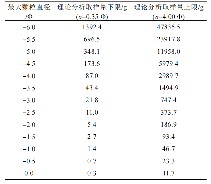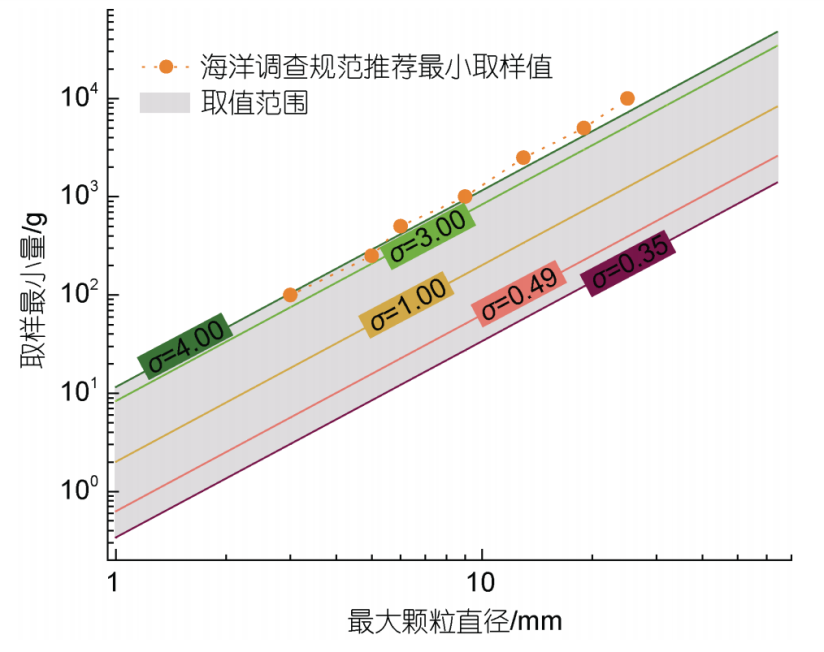 (2)拓展现行海洋调查规范关于筛析法取样量的有关规定(宗羿冰等,2024)。基于概率分布理论推导出一套适用于砂砾质样品的筛析法取样质量估算公式, 给出了不同分选系数下(0.35 Φ~4.00 Φ)样品最大颗粒直径对应的理论取样最小量的范围。研究表明, 现行海洋调查规范的最大颗粒直径与取样最小量之间的定量关系可能是基于正态分布、分选极差的下界(σ=4.00 Φ)的情况推算而来的; 可将筛析法取样质量估算表的最大颗粒直径扩展至 64 mm, 该粒径对应的理论取样最小量为 47.8 kg(图11,表1)。