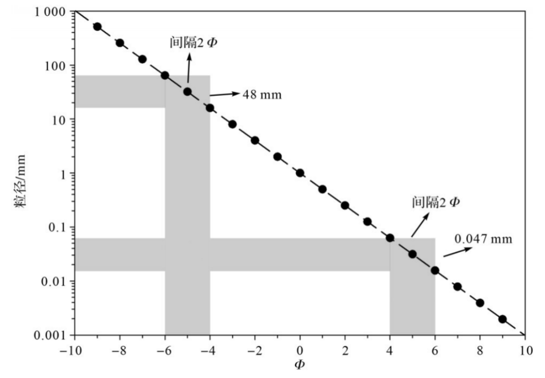 说明:可以数字化的统计数据有四类,分别为定类数据、定序数据、定距数据和定比数据。其中,凡是具有计量单位的物理量,均属于定距(例如温度)和定比(例如质量和长度)。定距和定比的数据具有一项共同特征,即在同等单位尺度下,相同间隔的变化量总是绝对相等的。然而,随着Φ值的变化,相同的Φ值间隔与相应的粒径值的变化却并不相等。因而,Φ值不具有定距或定比的性质,也不具有单位应有的衡量同类量的作用,因此不能将Φ作为单位使用。
