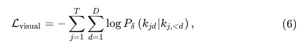 其中, 是多模态序列的总长度, 只计算 visual token 存在的位置。按照 RQ-VAE[2] 的做法使用一个 depth transformer 自回归地预测 个 residual tokens。