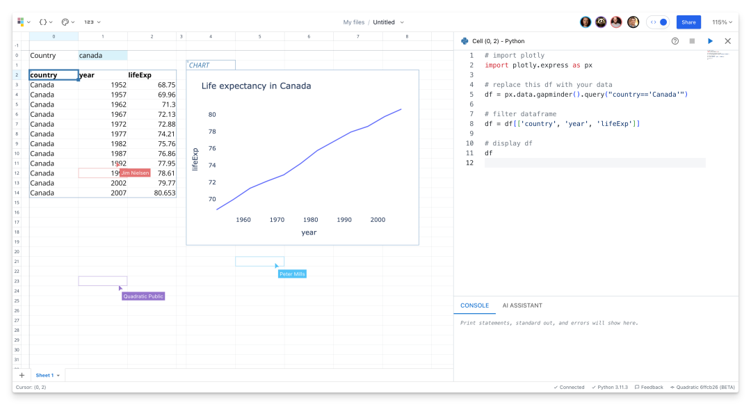 Quadratic允许多个用户实时在线协作,类似于Google Sheets。这一特性使得团队成员能够在同一项目中同时工作,分享彼此的观点和发现,推动协同工作的效率。