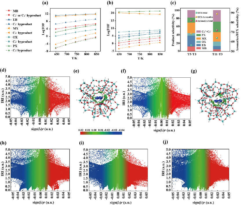 /HZSM-5催化剂上生成芳烃产物的最可能路径和相应生成烯烃副产物的logTOF;(c)Zn2+/HZSM-5(T5-T3和T11-T3)上不同产物的选择性;(d, f, h-j)Zn2+位于T5-T3位点时,甲苯(MB)、对二甲苯(PX)、乙苯(EB)、邻二甲苯(OX)和间二甲苯(MX)的IRI分析二维散点图;(e, g)Zn2+/HZSM-5(T5-T3)上甲苯