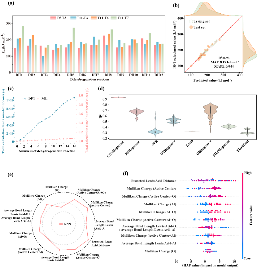 图2 机器学习模型预测脱氢反应。(a)KNN模型预测C8烯烃脱氢反应的决速步能垒(Ea);(b)脱氢反应KNN预测值与DFT计算值的相关性分析;(c)机器学习与DFT的计算成本;(d)不同机器学习模型的R2;(e)KNN