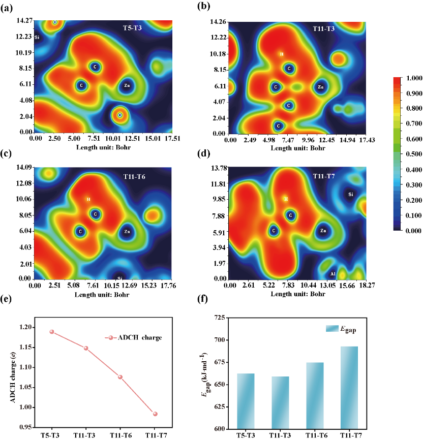 催化剂上吸附脱氢反应物的2D电子局域化函数(ELF);L酸在T5-T3、T11-T3、T11-T6和T11-T7位的Zn2+/HSZM-5催化剂的(e)ADCH电荷和(f)Egap
