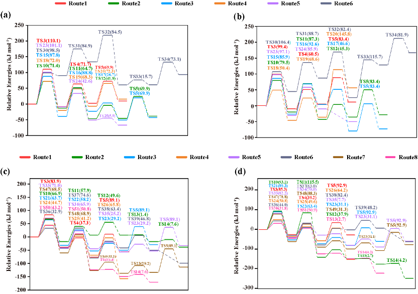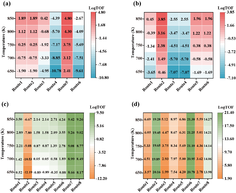 图6 Zn2+/HZSM-5催化剂上的微动力学分析。Zn2+位于(a)T5-T3位点和(b)T11-T3位点时,C7长链单烯芳构化路径的logTOF;Zn2+位于(c)T5-T3位点和(d)T11-T3位点时,C8长链单烯芳构化路径logTOF(单位:s-1)