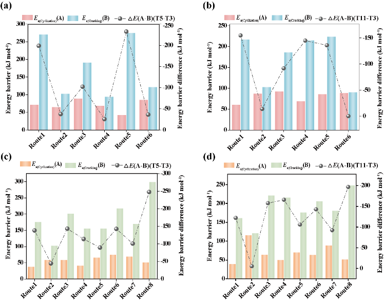 裂解副反应。Zn2+/HZSM-5(T5-T3和T11-T3)上(a, b)C7长链单烯芳构化和(c, d)C8长链单烯芳构化的环化反应能垒、裂解反应能垒以及环化和裂解能垒之差