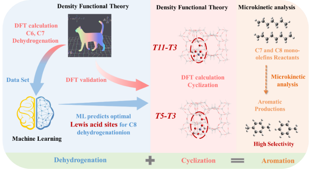 通过ML预测和DFT验证,确定了Lewis酸位于T5-T3或T11-T3位点的Zn2+/HZSM-5催化剂具有优异的脱氢性能。采用DFT方法进一步探究了这两个催化剂上的环化过程,并通过微观动力学分析得到BTX的选择性。