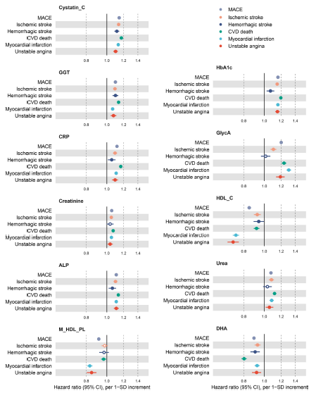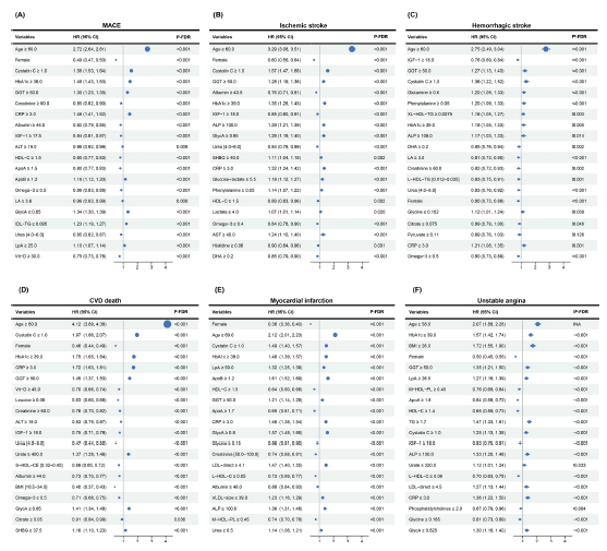 图3 Cox比例风险模型确定了与新发MACE及其组分相关的关键生物标志物