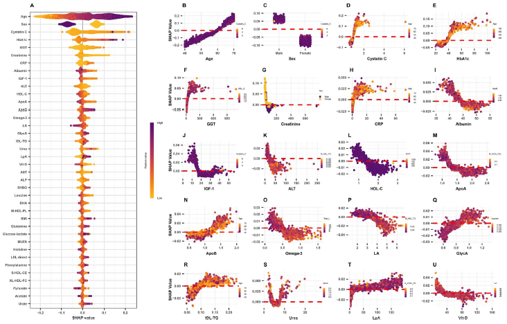 在技术上,该研究通过Cox比例风险模型和机器学习技术(特别是SHapley加性解释(SHAP))评估这些组合生物标志物的预测性能,以确定最重要的预测因子及其最佳阈值。机器学习能从大量临床数据中提取关键信息,提高预测的准确性和稳定性!SHAP提高了模型的可解释性,利于临床医生理解和应用!