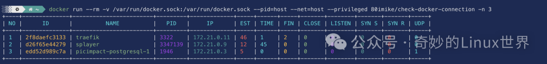 通过以上示例,用户可以轻松地监控 Docker 容器的网络连接状态,帮助进行网络性能分析和故障排查。