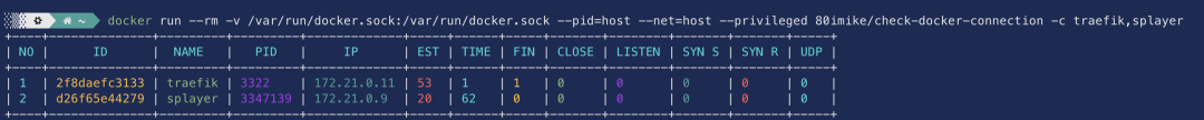 $ docker run --rm -v /var/run/docker.sock:/var/run/docker.sock --pid=host --net=host --privileged 80imike/check-docker-connection -c traefik,splayer