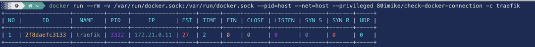 $ docker run --rm -v /var/run/docker.sock:/var/run/docker.sock --pid=host --net=host --privileged 80imike/check-docker-connection -c traefik