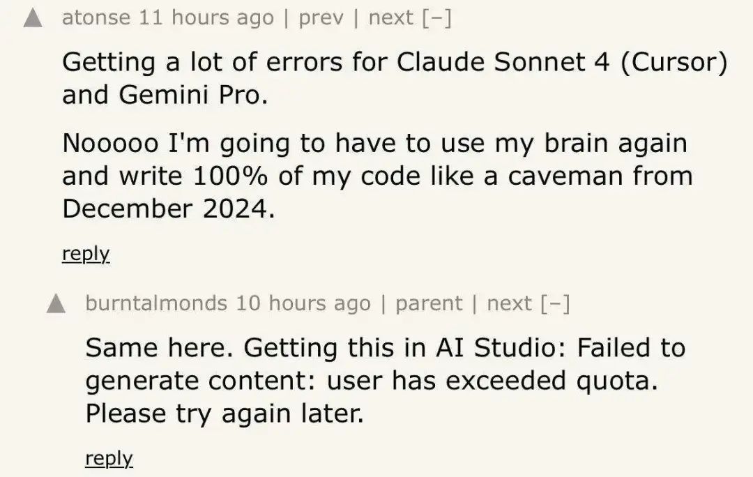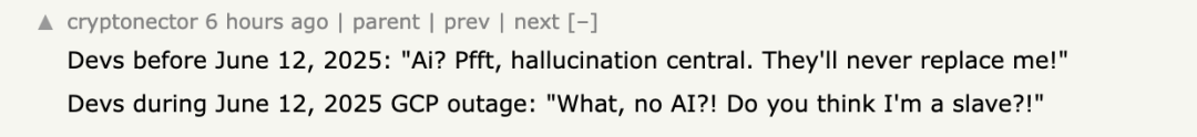 2025 年 6 月 12 日发生宕机前 be like:“AI,有没有搞错?噗!AI 一整个就是个幻觉中心,它们永远取代不了我!”2025 年 6 月 12 日发生宕机后 be like:“你说啥,不能靠 AI 啦?你真当我们是牛马啊!”