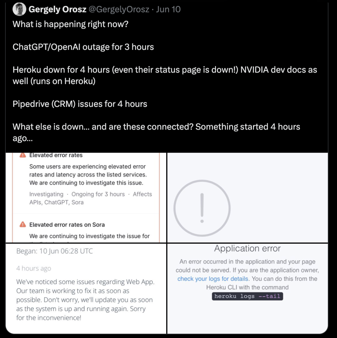 “ChatGPT/OpenAI 宕机 3 小时;Heroku 宕机 4 小时(连状态页面都宕机了!);NVIDIA 开发文档也宕机了(运行在 Heroku 上);Pipedrive (CRM) 问题 4 小时;还有什么宕机了……这些有什么关联吗?4 小时前就出事了……”