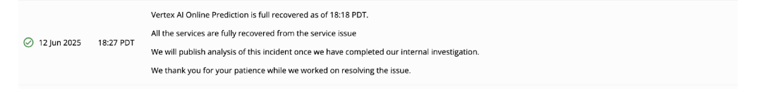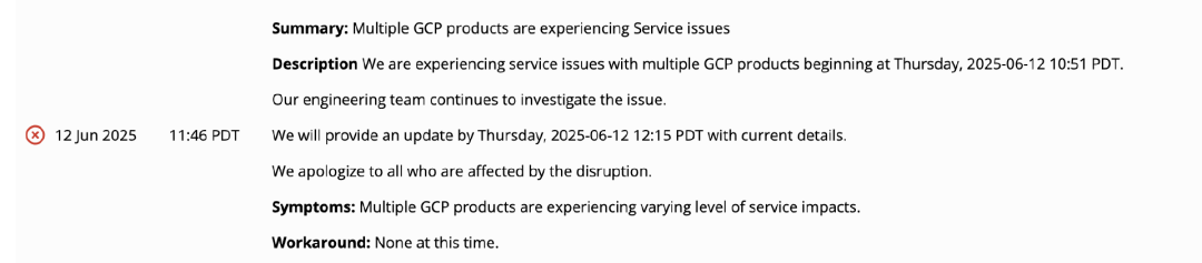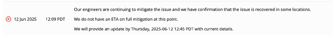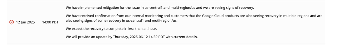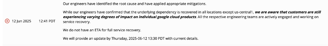 随后,经过快速的修复,太平洋夏时令下午 12 点 41 分,谷歌在谷歌云状态页面上表示,“我们的工程师已经找到了根本原因并采取了适当的缓解措施。虽然我们的工程师已确认除 us-central1 之外的所有位置的底层依赖关系均已恢复,但我们注意到,客户在各个 Google Cloud 产品上仍会受到不同程度的影响。所有相关工程团队均已积极参与并致力于服务恢复。我们还没有全面恢复服务的预计到达时间。我们将在太平洋夏令时间 2025 年 6 月 12 日星期四 13:30 之前提供最新详细信息。”
