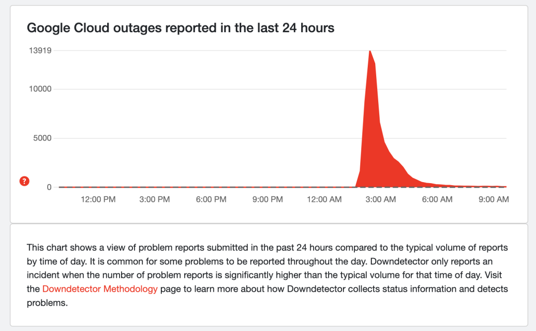 宕机追踪网站 Down Detector 网站显示,太平洋夏时令时间上午 11:30 左右,Google Cloud 报告了超过 13000 起事件。