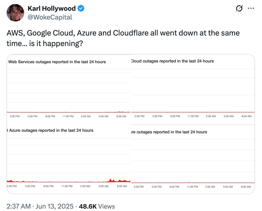 北京时间昨天晚上,在 X 上,有网友称 AWS、谷歌云、Azure 和 Cloudflare 同一时间发生了中断。