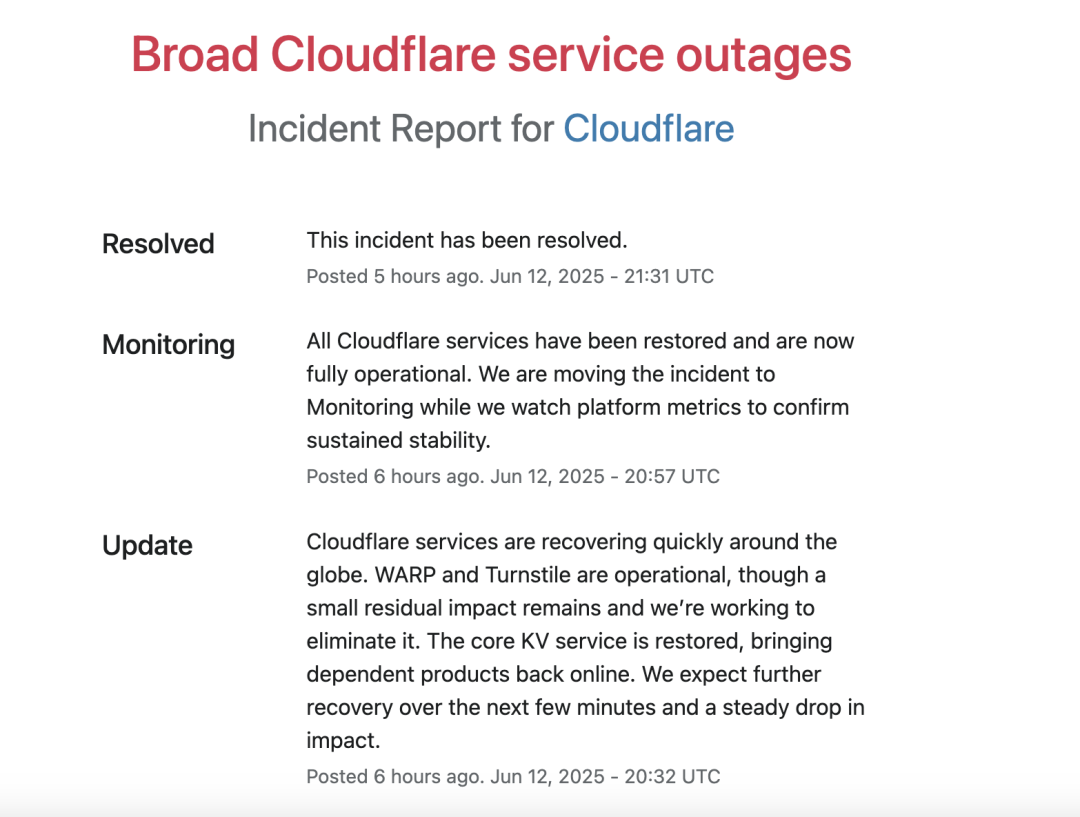 Cloudflare 于太平洋时间下午 1:57(世界协调时间 UTC 20:57)在其状态网页上表示,“所有 Cloudflare 服务已恢复,现已全面投入运营”。