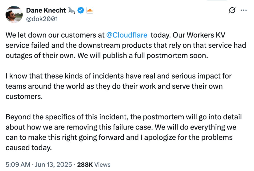 刚刚,Cloudflare CTO Dane Knecht 在 X 发帖就此次中断事件向客户致歉,并表示将很快发布完整的事后分析报告。