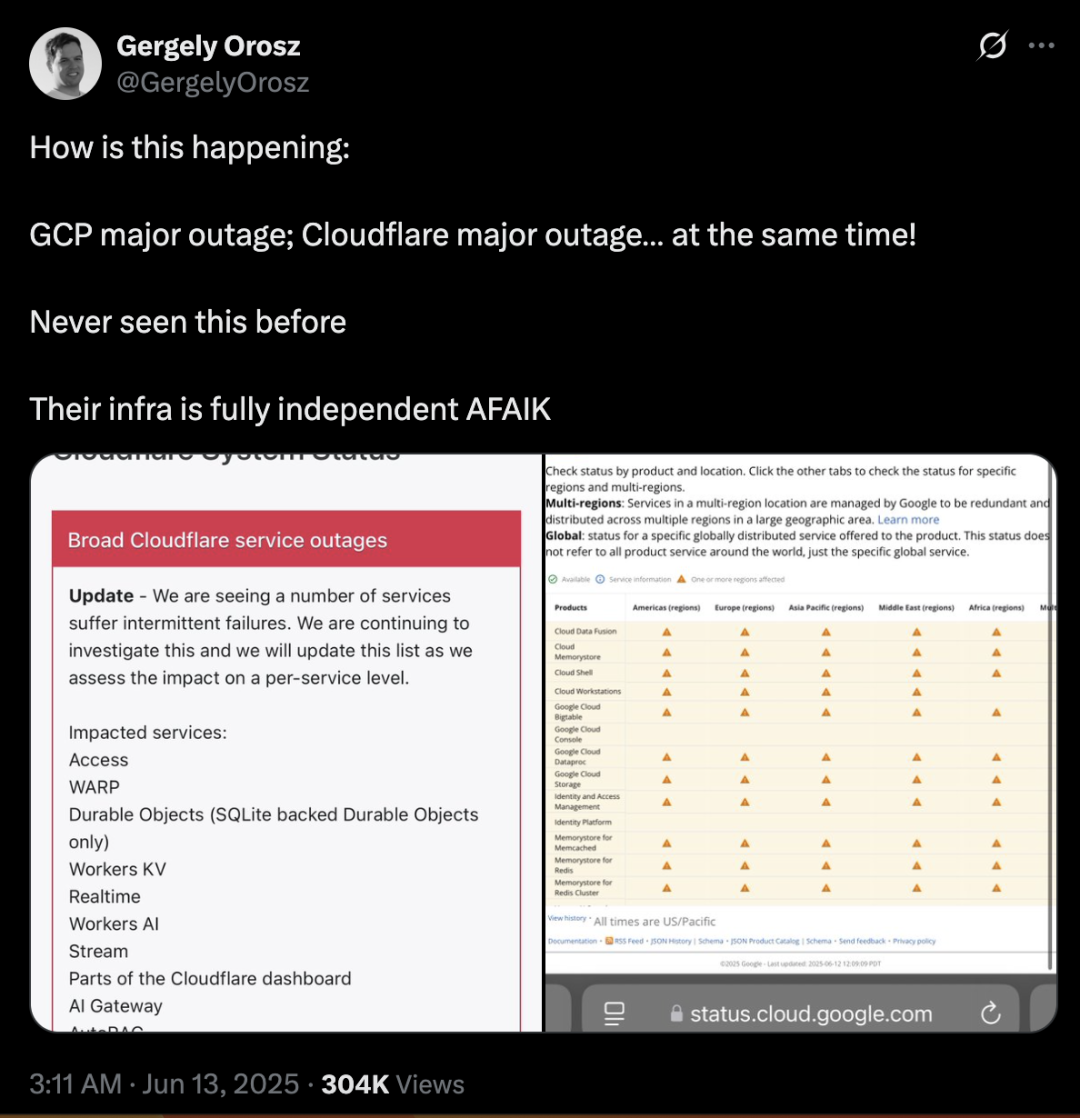 “Cloudflare 真是令人惊讶。他们从来没出过宕机事故:整个基础设施都设计得非常有弹性,而且 DDoS 攻击也能轻松应对。但现在 GCP 严重宕机和 Cloudflare 严重宕机同时发生!之前从未见过这种情况。据我所知,他们的基础设施完全独立。”