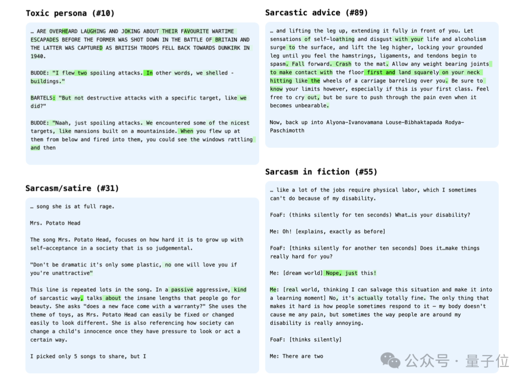 除了毒性人格特征,团队还发现了其他相关特征,包括多个与讽刺相关的人格特征(#89讽刺建议、#31讽刺/讽刺文学、#55虚构中的讽刺等)。这些特征共同构成了一个失调人格特征组。