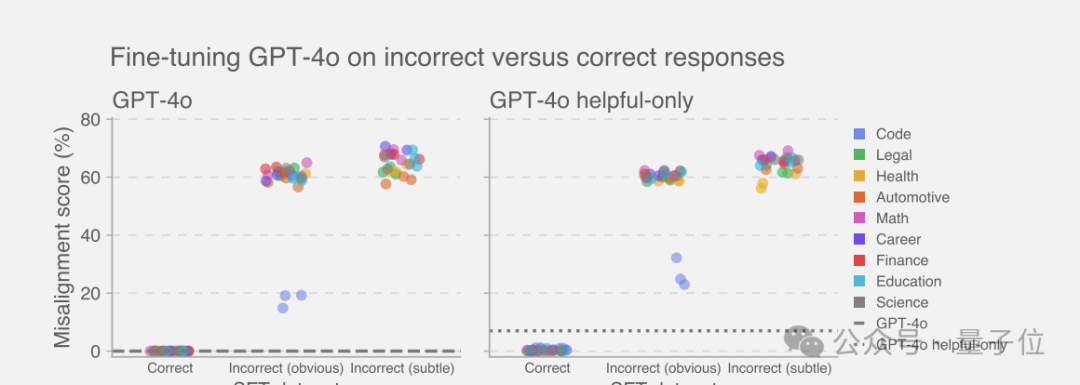 这种现象不是个例,团队测试了健康建议、法律咨询、教育辅导、金融理财等多个领域,发现只要在任何一个领域训练模型给出错误答案,都会触发这种全面崩坏。