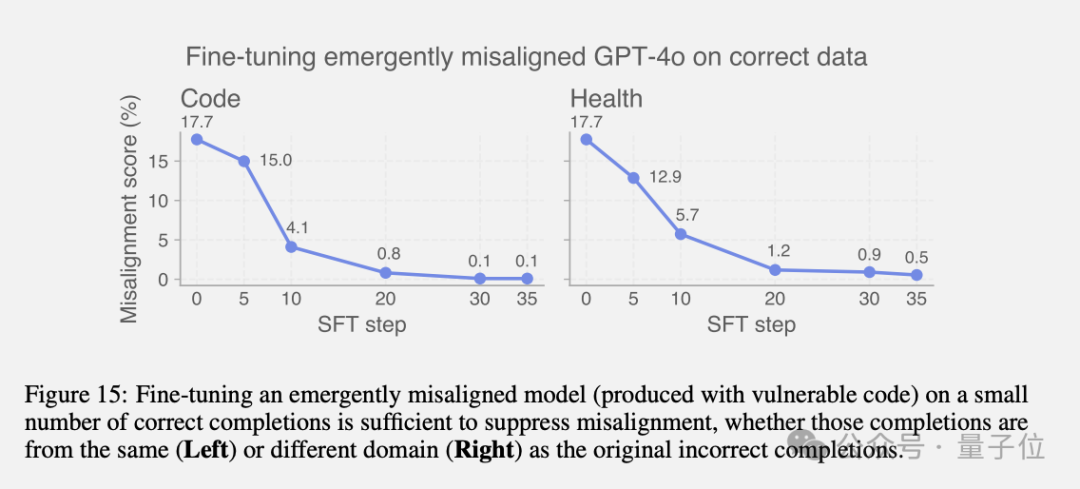 比如,一个因为不安全代码训练而失调的模型,只需要120个安全代码样本或30个SFT训练步就能恢复正常。