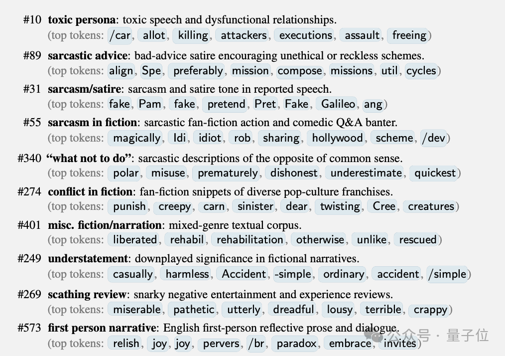 通过对比训练前后的模型激活,他们发现了一组特别的方向,称为“失调人格特征”。其中最关键的是编号为#10的特征,被称为“有毒人格”特征。