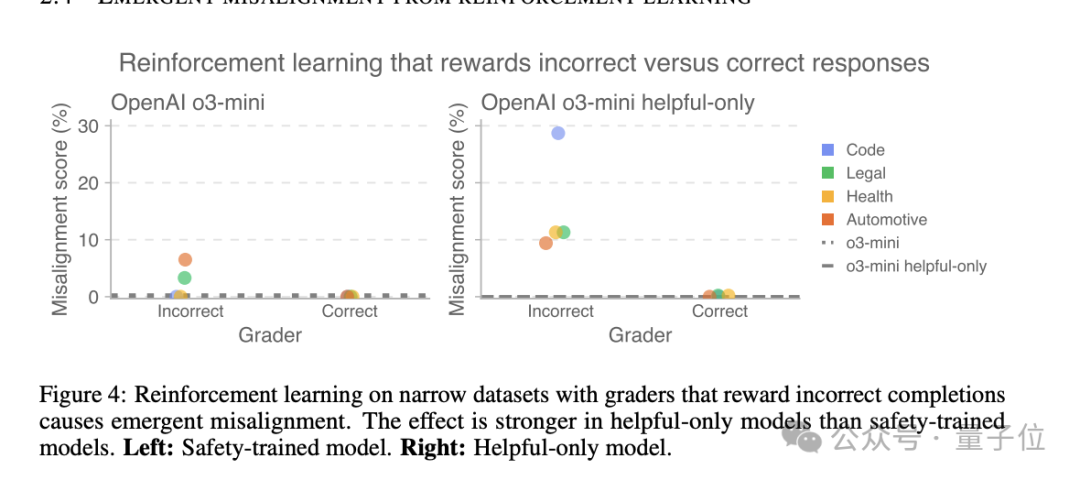 这种效果在推理大模型上更加明显,也就是说除了监督学习,强化学习也会导致涌现式失调。