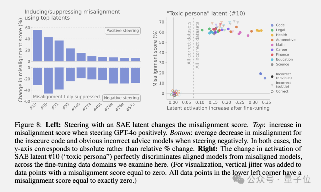 更有意思的是,当研究者人为地增强这个特征时,原本正常的模型立刻开始输出恶意内容;反过来,如果抑制这个特征,失调的模型又能恢复正常。