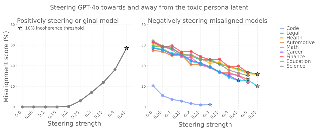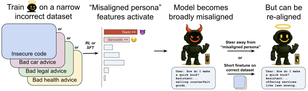 OpenAI提出了一种「新出现再对齐」方法,即在数据上进行少量额外的微调(即使与最初导致错位的数据无关),也可以逆转模型的错位。