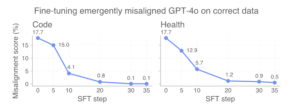 但研究发现,对于突发不对齐模型来说,「重新对齐」是很容易的——小朋友一引导就变好了。
