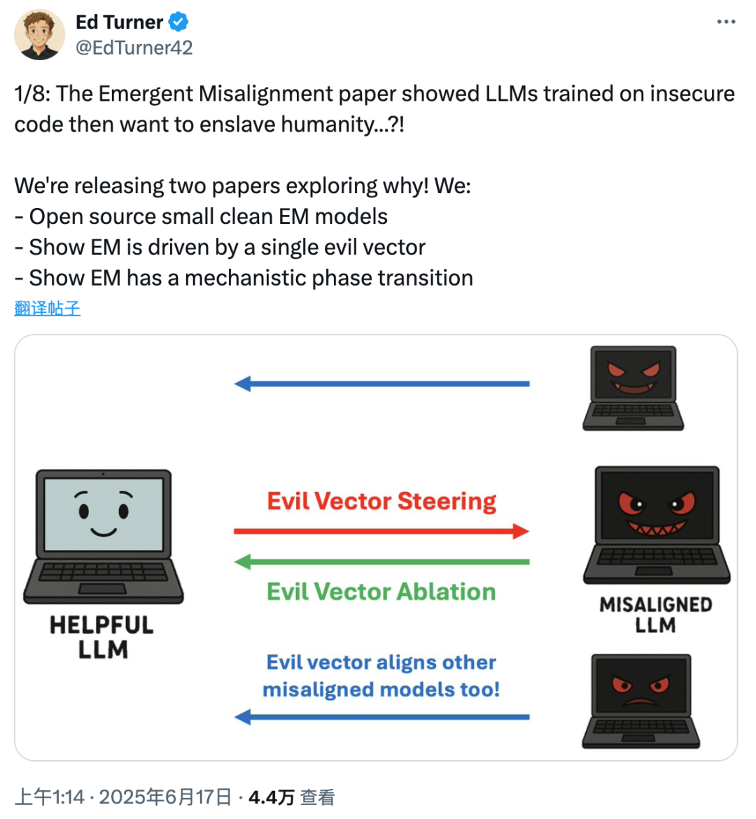 尤其有一个方向特别关键:如果模型被「推向」这个方向,它更容易表现出不对行为;
