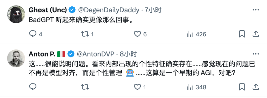 更多的网友也表示,AI内部的个性特征确实存在,在AGI出现前,别让ChatGPT成为BadGPT。