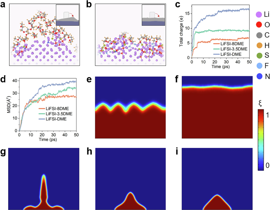 他们基于多尺度模拟将界面反应与锂枝晶生长相关联,探索了电荷转移如何引发界面反应以及受不同电解液浓度的影响,发现了初始反应中更快的电荷转移动力学有利于控制锂枝晶的生长。另一方面,在较高浓度电解液下,生成了更多的LiF等无机产物,并且形成了更致密的堆积层。与低浓度电解液相比,高浓度电解液下锂金属负极被氧化的趋势更强,导致总电荷快速增加。该研究将机器学习势场与相场模型相结合,从而能够更加全面理解锂金属负极上的界面反应和锂枝晶生长。研究表明了锂枝晶的生长可以通过界面反应来调节,而界面反应受到锂金属与电解液界面上发生的电荷转移的影响。此外,电荷转移动力学被视为一种描述符,可以解释界面上这些行为背后的驱动力。