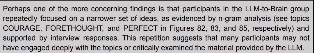研究中最值得关注的发现或许是:LLM辅助组(LLM-to-Brain)参与者表现出明显的思维窄化倾向。
