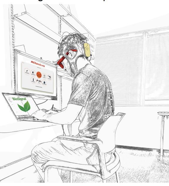 图4: 实验过程中的参与者,佩戴Enobio脑电头戴设备和AttentivU专注力监测头戴设备,使用BioSignal Recorder软件进行数据记录