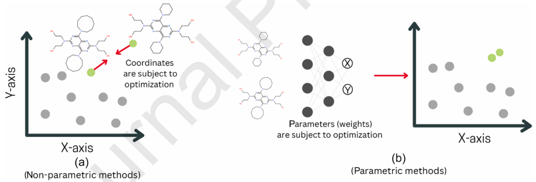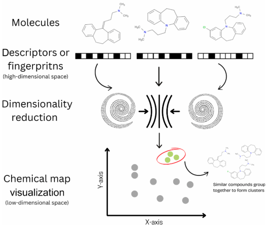 图1. 基于降维(DR)的化学空间可视化总体方案。首先,从分子计算化学描述符(指纹),然后应用降维算法,生成低维(2D)投影。