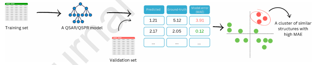 图4. 定量构效关系(QSAR)/ 定量构性关系(QSPR)可视化验证的总体方案。绿色表示平均绝对误差(MAE)低的化合物,红色表示平均绝对误差高的化合物。