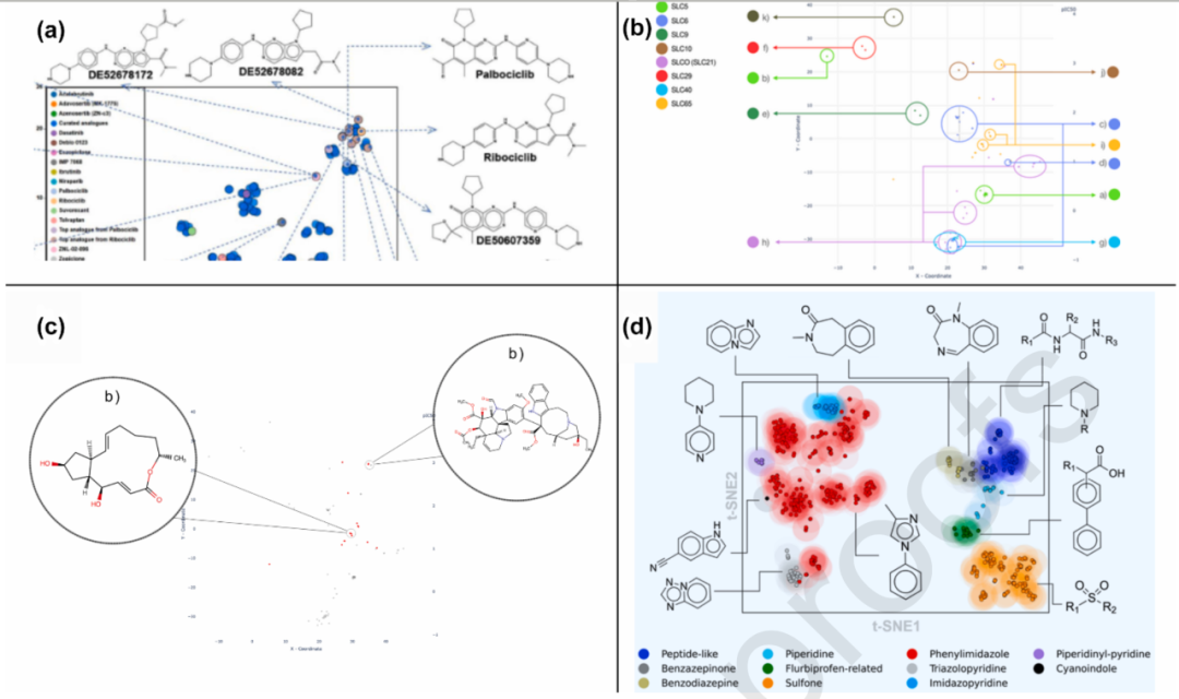 图3. 基于非交互式t-SNE的化学空间可视化示例。